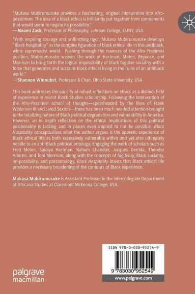 This book addresses the paucity of robust reflections on ethics as a distinct field of experience in recent Black Studies scholarship. Following the intervention of the Afro-Pessimist school of thought-spearheaded by the likes of Frank Wilderson III and Jared Sexton-there has been much needed attention brought to the totalizing nature of Black political degradation and vulnerability in America. However, an in depth reflection on the ethical implications of this political positionality is lacking and in places even implied to not be possible. Black Hospitality conceptualizes what the author argues is the aporetic experience of Black ethical life as both excessively vulnerable within and yet also ultimately hostile to an anti-black political ontology. Engaging the work of scholars such as Fred Moten, Saidiya Hartman, Nahum Chandler, Jacques Derrida, Theodor Adorno, and Toni Morrison, along with the concepts of fugitivity, Black sociality, im-possibility, and paraontology, BlackHospitality insists that Black ethical life provides a necessary broadening of the contours of Black experience.