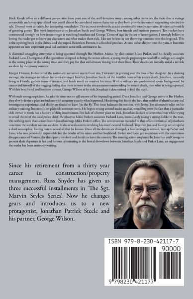 Black Kayak offers us a different perspective from your run of the mill detective story; among other items are the facts that a vintage automobile and a very specialized boat could almost be considered minor characters as they both provide important supporting roles in this tale. Unusual most certainly, but intriguing nonetheless. This account involves the reader emotionally into the narrative; it is not a chronicle of guessing games. This book introduces us to Jonathan Steele and George Wilson, best friends and business partners. Test readers have commented strongly on how interesting it is watching Jonathan and George 'Come of Age' in the art of investigation. I strongly believe in letting the reader get to know my characters and what makes them tick. I do not believe in just throwing someone into the deep end. This is the opening book in the Series, and the sequel, Relentless Pursuit, is a finished product. As one delves deeper into this yarn, it becomes apparent on how important good old common sense still continues to be. A diamond smuggling enterprise is being operated through Bar Harbor, Maine, by club owner Miles Parker, and his deadly associate Packard Lane. During one of the operations designed to bring the stones ashore, a young couple preparing to head off to college, are caught in the wrong place at the wrong time and they pay for that unfortunate timing with their lives. Their deaths are initially ruled a terrible accident by the county coroner. Margot Henson, Innkeeper of the nationally acclaimed ocean front inn, Tidewater, is grieving over the loss of her daughter. In a choking message, she manages to inform her semi-estranged brother, Jonathan Steele, of the horrible news of his niece's death. Jonathan, currently living in Florida, gathers items of interest, and heads north to comfort his sister. With a military and professional sports background, he cannot rid himself of the nagging feeling that there is more to the circumstances surrounding his niece's death, than what is being reported. With his best friend and business partner, George Wilson at his side, Jonathan is determined to find the truth. With such strong suspicions, he asks his sister not to tell anyone of his impending arrival. Once Jonathan and George arrive in Bar Harbor, they slowly devise a plan, to find out with certainty exactly what happened. Hindering this feat is the fact, that neither of them has any real investigative experience, and thusly are forced to learn 'on the fly'. This issue balances the tension, with levity. Jon ultimately relies on his military training, but mostly, on plain old common sense. He begins nosing around under an alias, stumbling onto the fact that a particular club owner in town has a history of drug involvement. For lack of a better place to look, Jonathan decides to scrutinize him while trying to avoid the ire of the local police chief. He observes Miles Parker's associate Packard Lane, immediately taking a strong dislike to the man. On nothing more than a mere hunch Jonathan bugs Miles Parker's office. The conversations recorded in that office confirm all of Jonathan's concerns; the accident was no accident. It also reveals secrets involving his sister's second husband. Together, Jon and George set a trap for a third accomplice, forcing him to reveal all that he knows. Once all the details are divulged, a final strategy is devised, to trap Parker and Lane, who was personally responsible for the deaths of his niece and her boyfriend. Parker and Lane get suspicious with the mysterious disappearance of Ronnie, the third party involved and decide to leave the country. The ensuing action employed by Jonathan and George to prevent their departure is fast and furious culminating in the brutal showdown between Jonathan Steele and Parker Lane; an engagement the reader has been anxiously waiting.