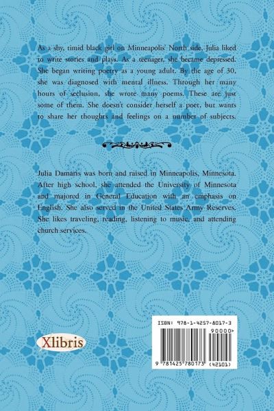 Book Description In this book, Julia Damaris shares her impressions on various issues in her life. These are mostly love poems, but she also touches on losing a child, racism, nature, family, and her faith. She shows in her work that she is a person of many emotions. Even with mental illness, she considers herself a normal person. In this book, she takes you through 20 years of her life. There is something for just about everyone, and Julia hopes that someone will read one of her poems, relate to it, and not feel alone.