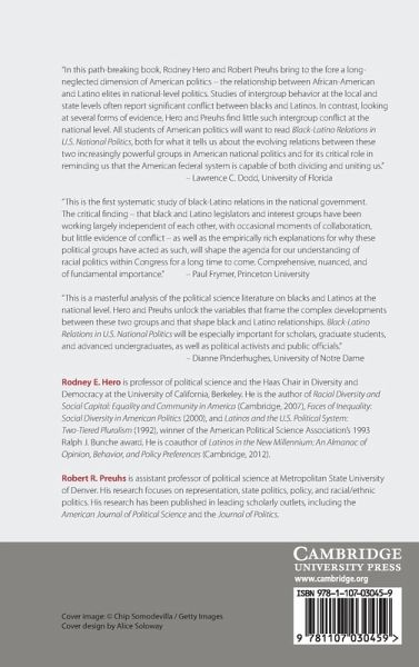 Social science research has frequently found conflict between Latinos and African Americans in urban politics and governance, as well as in the groups' attitudes toward one another. Rodney E. Hero and Robert R. Preuhs analyze whether conflict between these two groups is also found in national politics. Based on extensive evidence on the activities of minority advocacy groups in national politics and the behavior of minority members of Congress, the authors find the relationship between the groups is characterized mainly by non-conflict and a considerable degree of independence. The question of why there appears to be little minority intergroup conflict at the national level of government is also addressed. This is the first systematic study of Black-Latino intergroup relations at the national level of United States politics.