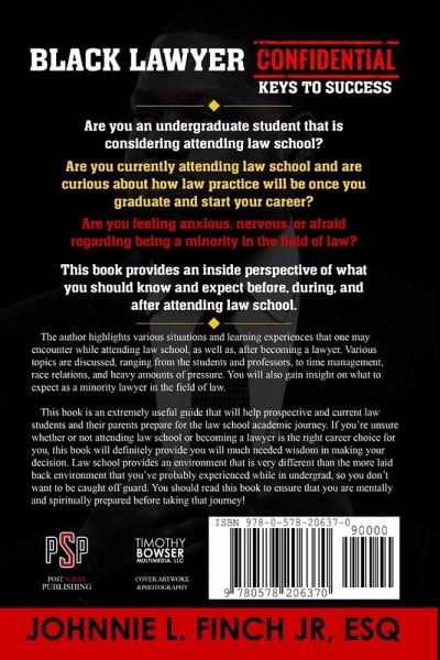 The author highlights various situations and learning experiences that one may encounter while attending law school, as well as, after becoming a lawyer. Various topics are discussed, ranging from the students and professors, to time management, race relations, and heavy amounts of pressure. You will also gain insight on what to expect as a minority lawyer in the field of law. This book is an extremely useful guide that will help prospective and current law students and their parents prepare for the law school academic journey. If you're unsure whether or not attending law school or becoming a lawyer is the right career choice for you, this book will definitely provide you will much needed wisdom in making your decision.