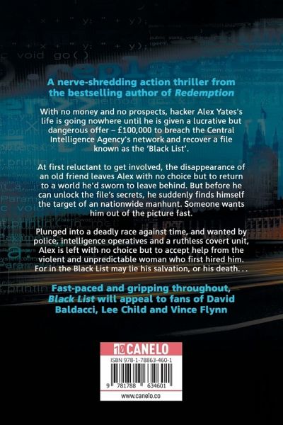 A nerve-shredding action thriller from the bestselling author of Redemption With no money and no prospects, hacker Alex Yates's life is going nowhere until he is given a lucrative but dangerous offer – £100,000 to breach the Central Intelligence Agency's network and recover a file known as the ‘Black List’ At first reluctant to get involved, the disappearance of an old friend leaves Alex with no choice but to return to a world he'd sworn to leave behind. But before he can unlock the file’s secrets, he suddenly finds himself the target of an nationwide manhunt. Someone wants him out of the picture fast. Plunged into a deadly race against time, and wanted by police, intelligence operatives and a ruthless covert unit, Alex is left with no choice but to accept help from the violent and unpredictable woman who first hired him. For in the Black List may lie his salvation, or his death… Fast-paced and gripping throughout, Black List will appeal to fans of David Baldacci, Lee Child and Vince Flynn