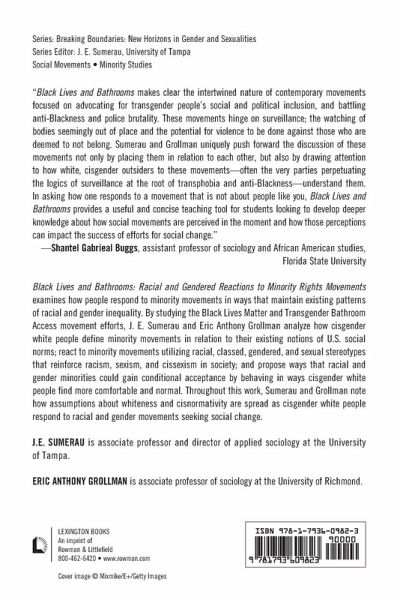 Black Lives and Bathrooms: Racial and Gendered Reactions to Minority Rights Movements examines how people respond to minority movements in ways that maintain existing patterns of racial and gender inequality. By studying the Black Lives Matter and Transgender Bathroom Access movement efforts, J.E. Sumerau and Eric Anthony Grollman analyze how cisgender white people define minority movements in relation to their existing notions of United States social norms; react to minority movements utilizing racial, classed, gendered, and sexual stereotypes that reinforce racism, sexism, and cissexism in society; and propose ways that racial and gender minorities could gain conditional acceptance by behaving in ways cisgender white people find more comfortable and normal. Throughout this work, Sumerau and Grollman note how assumptions about whiteness and cisnormativity are spread as cisgender white people respond to racial and gender movements seeking social change.