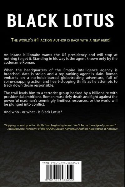 The world's #1 action author is back with a new hero! An insane billionaire wants the US presidency and will stop at nothing to get it. Standing in his way is the agent known only by the codename Roman. When the headquarters of the Empire intelligence agency is breached, data is stolen and a top-ranking agent is slain. Roman embarks on a no-holds-barred globetrotting adventure, full of spine-snapping action and heart-stopping thrills as he attempts to track down those responsible. The trail leads him to a terrorist group backed by a billionaire with presidential ambitions. Roman must defy death and fight against the powerful madman's seemingly limitless resources, or the world will be plunged into conflict. And who - or what - is Black Lotus? "Gripping, non-stop action thrills from beginning to end. You'll be on the edge of your seat." - Jack Massacre, President of the AAAAA (Action Adventure Authors Association of America)