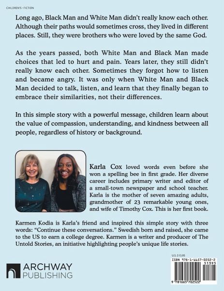 Long ago, Black Man and White Man didn't really know each other. Although their paths would sometimes cross, they lived in different places. Still, they were brothers who were loved by the same God. As the years passed, both White Man and Black Man made choices that led to hurt and pain. Years later, they still didn't really know each other. Sometimes they forgot how to listen and became angry. It was only when White Man and Black Man decided to talk, listen, and learn that they finally began to embrace their similarities, not their differences. In this simple story with a powerful message, children learn about the value of compassion, understanding, and kindness between all people, regardless of history or background.