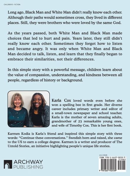 Long ago, Black Man and White Man didn't really know each other. Although their paths would sometimes cross, they lived in different places. Still, they were brothers who were loved by the same God. As the years passed, both White Man and Black Man made choices that led to hurt and pain. Years later, they still didn't really know each other. Sometimes they forgot how to listen and became angry. It was only when White Man and Black Man decided to talk, listen, and learn that they finally began to embrace their similarities, not their differences. In this simple story with a powerful message, children learn about the value of compassion, understanding, and kindness between all people, regardless of history or background.