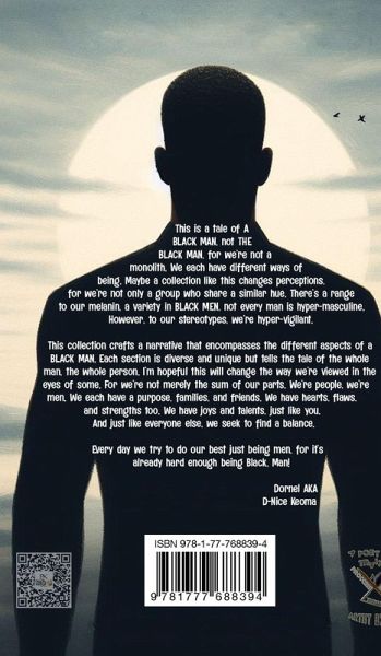 This is a tale of A BLACK MAN, not THE BLACK MAN, for we're not a monolith. We each have different ways of being. Maybe a collection like this changes perceptions, for we're not only a group who share a similar hue. There's a range to our melanin, a variety in BLACK MEN, not every man is hyper-masculine. However, to our stereotypes, we're hyper-vigilant. This collection crafts a narrative that encompasses the different aspects of a BLACK MAN. Each section is diverse and unique but tells the tale of the whole man, the whole person. I'm hopeful this will change the way we're viewed in the eyes of some. For we're not merely the sum of our parts. We're people, we're men. We each have a purpose, families, and friends. We have hearts, flaws, and strengths too. We have joys and talents, just like you. And just like everyone else, we seek to find a balance. Every day we try to do our best just being men, for it's already hard enough being Black, Man! Dornel AKA D-Nice Keoma