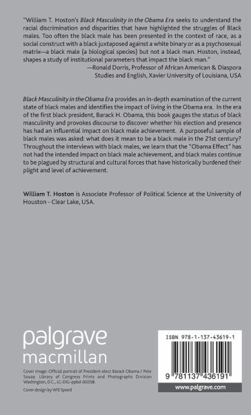 "William Hoston's Black Masculinity in the Obama Era seeks to understand the racial discrimination and disparities that have highlighted the struggles of Black males. Too often the black male has been presented in the context of double-consciousness; race as a social construct in congruence with the dichotomy of skin-color, a black juxtaposed against a white binary; a psychosexual matrix a black male (a biological species) but not a black man; and psychohistory a study of the changing meaning of symbols. Hoston, instead, shapes a study of institutional parameters that impact the black man." Ronald Dorris, Professor of African American & Diaspora Studies and English, Xavier University of Louisiana, USA