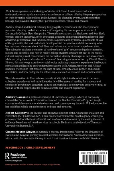 This text presents an anthology of stories of African American and African undergraduate and graduate studentsâ experiences at college, offering lifespan perspectives on their formative relationships and influences, life-changing events, and the role their heritage has played in shaping their personal identities, values, and choices.