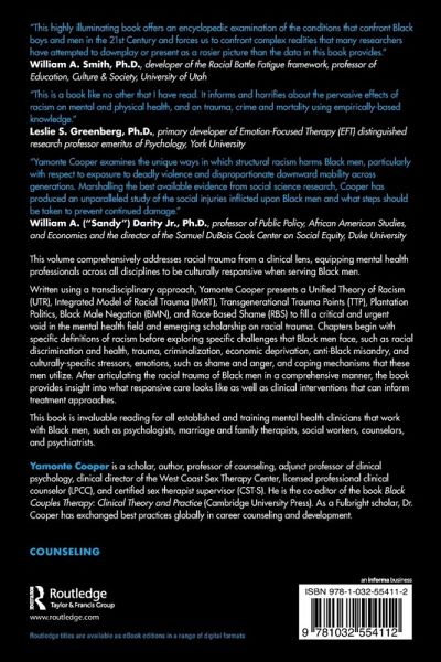 Written using a transdisciplinary approach, Yamonte Cooper presents a Unified Theory of Racism (UTR), Integrated Model of Racial Trauma (IMRT), Transgenerational Trauma Points (TTP), Plantation Politics, Black Male Negation (BMN), and Race-Based Shame (RBS) to fill a critical and urgent void in the mental health field and emerging scholarship on racial trauma. Chapters begin with specific definitions of racism before exploring specific challenges that Black men face, such as racial discrimination and health, trauma, criminalization, economic deprivation, anti-Black misandry, and culturally-specific stressors, emotions, such as shame and anger, and coping mechanisms that these men utilize. After articulating the racial trauma of Black men in a comprehensive manner, the book provides insight into what responsive care looks like as well as clinical interventions that can inform treatment approaches.