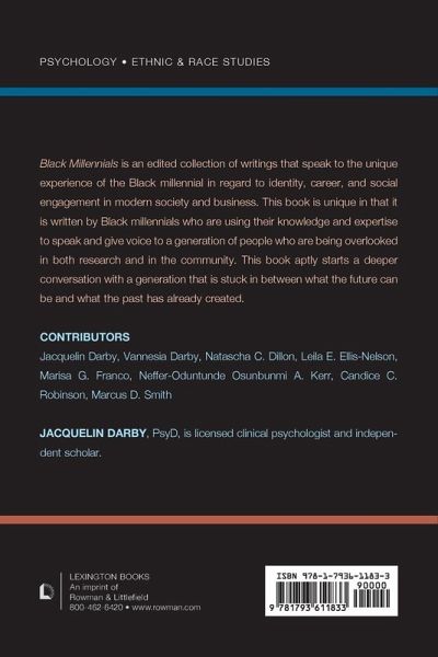 Introduction Section I: Our Identity Chapter 1: Marisa Franco, PhD: The Status of Multiracial Millennials in the Black Community Chapter 2: Neffer Oduntunde, BA: The Complexity of Color: Observations and Thoughts on Combating Colorism within Communities of Color Chapter 3: Marcus Smith, MA: The Intersectionality of Attachment Style and Inter-personal Dynamics Chapter 4: Natascha Dillon, PsyD: An Examination of the Father-Child Relationship within African American household. Section II: Our Ambition Chapter 5: Vannesia Darby, MA: A Systematic Review of Motivational Strategies for Black Millennials in a Conscious Society. Chapter 6: Lelia Ellis-Nelson, PsyD: Branding: Do You? Section II: Our Activism Chapter 7: Jacquelin Darby, PsyD: Pedagogy of Wokeness: A Conceptualization of Black Millennial Liberation Chapter 8: Candice Robinson, MA: The Civic Life of the Black Millennial Conclusion Index About the Editor and Contributors