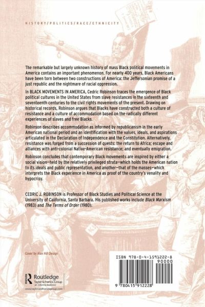 Cedric Robinson traces the emergence of Black political cultures in the United States from slave resistances in the 16th and 17th centuries to the civil rights movements of the present. Drawing on the historical record, he argues that Blacks have constructed both a culture of resistance and a culture of accommodation based on the radically different experiences of slaves and free Blacks.