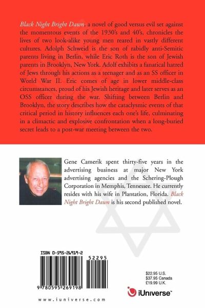 Black Night Bright Dawn, a novel of good versus evil set against the momentous events of the 1930's and 40's, chronicles the lives of two look-alike young men reared in vastly different cultures. Adolph Schweid is the son of rabidly anti-Semitic parents living in Berlin, while Eric Roth is the son of Jewish parents in Brooklyn, New York. Adolf exhibits a fanatical hatred of Jews through his actions as a teenager and as an SS officer in World War II. Eric comes of age in lower middle-class circumstances, proud of his Jewish heritage and later serves as an OSS officer during the war. Shifting between Berlin and Brooklyn, the story describes how the cataclysmic events of that critical period in history influences each one's life, culminating in a climactic and explosive confrontation when a long-buried secret leads to a post-war meeting between the two.