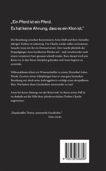 Auf einem Dressurturnier taucht plötzlich der Doppelgänger eines berühmten Pferdes auf - und verschwindet nach einem verpatzten Start genauso schnell wieder. Kurz darauf wird sein Reiter tot in den Peene-Sümpfen gefunden. Und in einem einsamen Hinterhof-Labor klont ein Wissenschaftler Pferde ...