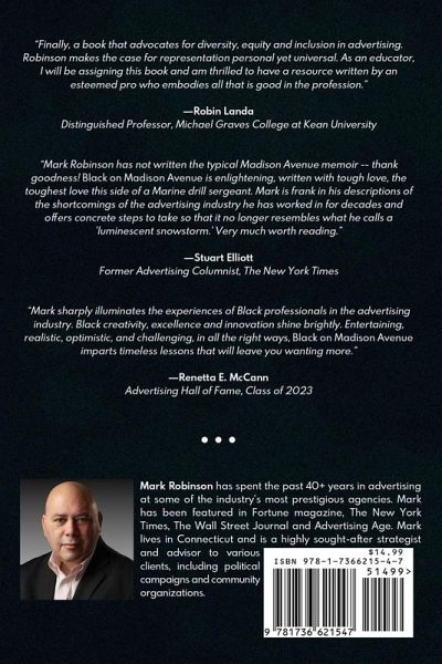"Black on Madison Avenue" tells the shocking truth about one of the most un-diverse white-collar professions in America. "Black on Madison Avenue" tells the explosive stories that Madison Avenue doesn't want you to read. "Black on Madison Avenue" reveals the incredible experiences of a Black man who has spent 40+ years on Madison Avenue at some of the advertising industry's most prestigious agencies and gives readers a rare glimpse of what it's like to be one of the very, very few Black professionals in the advertising agency business. Advertising decides what America wants. And yet, for an industry that professes to be the vanguard of creativity, popular culture and forward thinking, advertising is one of the most un-diverse white-collar professions in America. Surprisingly, despite all of its public gestures of "wokeness", Madison Avenue would like to keep it that way. "Black on Madison Avenue" explains how - and why - the author landed on Madison Avenue, and shares some of his incredible adventures over the past 40+ years. Yes, adventures. Have you ever gotten into a shouting match with a Venezuelan Army general in the middle of a military coup? He has. He kidnapped advertising legend Jim Jordan, insulted high-ranking Chinese government officials at a formal dinner and launched the first multicultural marketing holding company. Mark Robinson was the co-founder of Spike/DDB, along with filmmaker Spike Lee and has stories no one else could tell. Robinson's stories include Bill Cosby, Mike Tyson, Vanessa Williams, Usher, Oprah, Zsa Zsa Gabor, James Brown and Notorious B.I.G. "I have given my entire adult professional life to this business. Advertising is not just what I do. It is a part of who I am. I am Black on Madison Avenue."