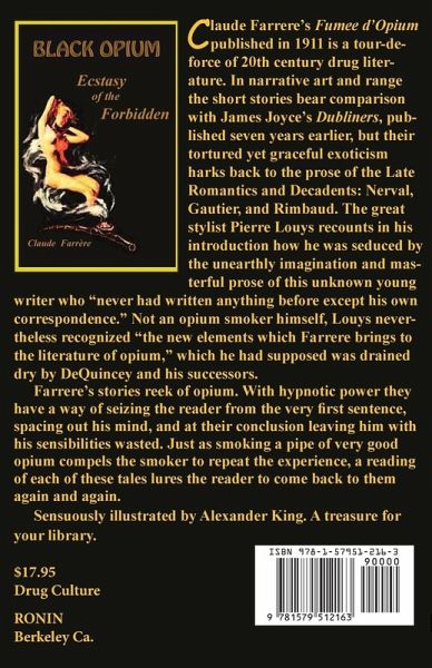 Interest in heroin is surging back after years of dormancy. Why? Supply and demand! Drug cartels have increased the supply of heroin, so that it is cheaper and purer than ever before. Secondly, the Federal government's recent crack down on popular prescription opiates like OxcyContin, Percocet, and Vicodin so they are increasingly hard and costly to obtain on the black market. A recent study reveals that people who had recently abused prescription opiates are 19 times more likely to try heroin. Fueled by a boom in supply and a decline in cost, heroin use is up around the nation and spreading to segments of the population once considered unlikely users. "Cool people are doing it!” Remember the old slogan: "Sex, Drugs, and Rock 'n Roll”? Heroin has a sexy side-very sexy. Black Opium: Ecstasy of the Forbidden brings heroin's sexy visions to life. The world of black opium is a forbidden world where human bodies find themselves possessed and driven by desires which consume them in the flames of hot-blooded ecstasy, Black Opium describes every aspect of an opium smoker's life in lurid detail. Often compared to James Joyces' Dubliners, Farrère's Black Opium consists of seventeen compelling tales delineating six periods in the history and use of opium. This edition of Black Opium is a reissue of And/Or Press' 1974 Fitz Hugh Ludlow edition, which features salacious illustrations by Alexander King, and the addition of a foreword by Dr. Moraes.