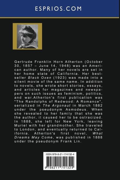 Gertrude Franklin Horn Atherton (October 30, 1857 - June 14, 1948) was an American author. Many of her novels are set in her home state of California. Her bestseller Black Oxen (1923) was made into a silent movie of the same name. In addition to novels, she wrote short stories, essays, and articles for magazines and newspapers on such issues as feminism, politics, and war. Atherton's first publication was "The Randolphs of Redwood: A Romance", serialized in The Argonaut in March 1882 under the pseudonym Asmodeus. When she revealed to her family that she was the author, it caused her to be ostracized. In 1888, she left for New York, leaving Muriel with her grandmother. She traveled to London, and eventually returned to California. Atherton's first novel, What Dreams May Come, was published in 1888 under the pseudonym Frank Lin.