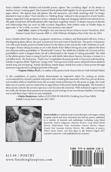BLACK PAPER ALBUM is the story in poetic form of a young girl growing up in the 1940's and 50's absorbing her grandparent's immigration to America and their hardscrabble life in the foothills of the Catskill Mountains and her parent's struggles to make a life for themselves and their family in the hustle of New York City. Captured in family photographs dating back to turn of the 20th century in a crumbling "black paper album," the family story emerges like "the driving spokes of a wheel always turning..." From the old bonds in the Catskill community of family, friends, and tradition where the past continues among the elderly men in the village synagogue chanting their prayers "as if they first heard it" and a NYC dance class where the dancers gather all they can of speed and desire, inhale deeply, glide through thin air until grounded...centered...still." Each of these poems follow a time line of change and discovery from post World War II to the beginning of a new era leading into the future and decisions to choose what to hold on to and what, by necessity to let go.