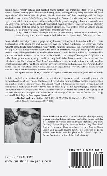 BLACK PAPER ALBUM is the story in poetic form of a young girl growing up in the 1940's and 50's absorbing her grandparent's immigration to America and their hardscrabble life in the foothills of the Catskill Mountains and her parent's struggles to make a life for themselves and their family in the hustle of New York City. Captured in family photographs dating back to turn of the 20th century in a crumbling "black paper album," the family story emerges like "the driving spokes of a wheel always turning..." From the old bonds in the Catskill community of family, friends, and tradition where the past continues among the elderly men in the village synagogue chanting their prayers "as if they first heard it" and a NYC dance class where the dancers gather all they can of speed and desire, inhale deeply, glide through thin air until grounded...centered...still." Each of these poems follow a time line of change and discovery from post World War II to the beginning of a new era leading into the future and decisions to choose what to hold on to and what, by necessity to let go.