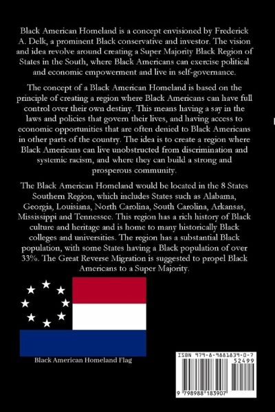 The Black Paper: Black American Homeland is a visionary concept proposed by Frederick A. Delk, a prominent Black Conservative and Investor. The vision and idea revolve around creating a Super Majority Black Contiguous Region of States in the United States, where Black Americans can exercise political and economic empowerment. The concept of a Black American Homeland is based on the principle of creating a region where Black Americans can have control over their own destiny. This means having a say in the laws and policies that govern their every day lives, and having access to economic opportunities that are often denied to Black Americans. The objective is to create a region where Black Americans can live immune from discrimination and systemic racism, and where they can build a strong and prosperous community. The Black American Homeland would be located in the 8 States Southern Region of the United States, which includes states such as Alabama, Georgia, Louisiana, North Carolina, South Carolina, Arkansas, Mississippi and Tennessee. This region has an incredible history of Black culture and activism, and is home to many historically Black colleges and universities. The region has a substantial Black population, with some states having a Black population of over 33%. One of the major objective of the Black American Homeland is political empowerment. This means that the region would be controlled and governed by Black Americans, with Black politicians and officials holding positions of power at all levels of government. This would allow Black Americans to create policies that are customized to their specific needs and interests, and to ensure that their voices are heard in the halls of power. Moreover to political empowerment, the Black American Homeland would also provide economic empowerment for Black Americans. This means creating economic opportunities that are often denied to Black Americans, such as access to capital, job training programs, and support for Black-owned businesses. The region would also prioritize investment in infrastructure and education, in order to create a strong and prosperous economy. Another important aspect of the Black American Homeland is the Great Reverse Migration. This refers to the reverse movement of Black Americans from other parts of the country to the 8 States Southern Region, in order to build a strong and vibrant community. The Great Reverse Migration would be encouraged and supported by a range of policies, including affordable housing programs, Farm land, Business Capital, job training and placement programs, and other incentives. The vision of a Black American Homeland is not without its challenges. Creating a Super Majority Black Region of States raises questions about segregation and exclusion. However, the objective of the Black American Homeland is not to create a separate and unequal society, but rather to create a region where Black Americans can thrive and reach their full potential.
