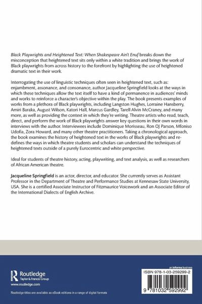 Black Playwrights and Heightened Text: When Shakespeare Ainâ t Enuf breaks down the misconception that heightened text sits only within a white tradition and brings the work of Black playwrights from across history to the forefront by highlighting the use of heightened dramatic text in their work.