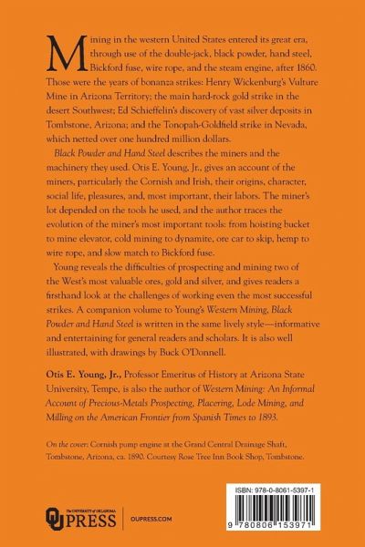 Mining in the western United States entered its great era after 1860 through use of the double-jack, black powder, hand steel, Bickford fuse, wire rope, and the steam engine. Those were the years of bonanza strikes: Henry Wickenburg's Vulture Mine in Arizona Territory; the main hard-rock gold strike in the desert Southwest; Ed Schieffelin's discovery of vast silver deposits in Tombstone, Arizona; and the Tonopah-Goldfield strike in Nevada, which netted over one hundred million dollars. Black Powder and Hand Steel describes the miners and the machinery they used. Otis E. Young, Jr., gives an account of the miners, particularly the Cornish and Irish, their origins, character, social life, pleasures, and, most important, their labors. The miner's lot depended on the tools he used, and the author traces the evolution of the miner's most important tools: from hoisting bucket to mine elevator, cold mining to dynamite, ore car to skip, hemp to wire rope, and slow match to Bickford fuse. Young reveals the difficulties of prospecting and mining two of the West's most valuable ores, gold and silver, and gives readers a firsthand look at the challenges of working even the most successful strikes. A companion volume to Young's Western Mining, Black Powder and Hand Steel is written in the same lively style - informative and entertaining for general readers and scholars. It is also well illustrated, with drawings by Buck O'Donnell.