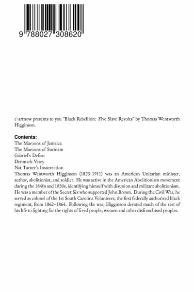 e-artnow presents to you "Black Rebellion: Five Slave Revolts" by Thomas Wentworth Higginson. Contents: - The Maroons of Jamaica - The Maroons of Surinam - Gabriel's Defeat - Denmark Vesey - Nat Turner's Insurrection - Thomas Wentworth Higginson (1823-1911) was an American Unitarian minister, author, abolitionist, and soldier. He was active in the American Abolitionism movement during the 1840s and 1850s, identifying himself with disunion and militant abolitionism. He was a member of the Secret Six who supported John Brown. During the Civil War, he served as colonel of the 1st South Carolina Volunteers, the first federally authorized black regiment, from 1862-1864. Following the war, Higginson devoted much of the rest of his life to fighting for the rights of freed people, women and other disfranchised peoples.