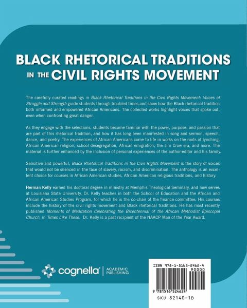 The carefully curated readings in Black Rhetorical Traditions in the Civil Rights Movement: Voices of Struggle and Strength guide students through troubled times and show how the Black rhetorical tradition both informed and empowered African Americans. The collected works highlight voices that spoke out, even when confronting great danger. As they engage with the selections, students become familiar with the power, purpose, and passion that are part of this rhetorical tradition, and how it has long been manifested in song and sermon, speech, dance, and poetry. The experiences of African Americans come to life in works on the roots of lynching, African American religion, school desegregation, African emigration, the Jim Crow era, and more. The material is further enhanced by the inclusion of personal experiences of the author-editor and his family. Sensitive and powerful, Black Rhetorical Traditions in the Civil Rights Movement is the story of voices that would not be silenced in the face of slavery, racism, and discrimination. The anthology is an excellent choice for courses in African American studies, African American religious traditions, and history. Herman Kelly earned his doctoral degree in ministry at Memphis Theological Seminary, and now serves at Louisiana State University. Dr. Kelly teaches in both the School of Education and the African and African American Studies Program, for which he is the co-chair of the finance committee. His courses include the history of the civil rights movement and Black rhetorical traditions. He has most recently published Moments of Meditation Celebrating the Bicentennial of the African Methodist Episcopal Church, in Times Like These. Dr. Kelly is a past recipient of the NAACP Man of the Year Award.