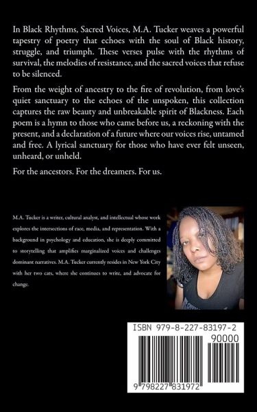 In Black Rhythms, Sacred Voices, M.A. Tucker weaves a powerful tapestry of poetry that echoes with the soul of Black history, struggle, and triumph. These verses pulse with the rhythms of survival, the melodies of resistance, and the sacred voices that refuse to be silenced. From the weight of ancestry to the fire of revolution, from love's quiet sanctuary to the echoes of the unspoken, this collection captures the raw beauty and unbreakable spirit of Blackness. Each poem is a hymn to those who came before us, a reckoning with the present, and a declaration of a future where our voices rise, untamed and free. A lyrical sanctuary for those who have ever felt unseen, unheard, or unheld. For the ancestors. For the dreamers. For us.