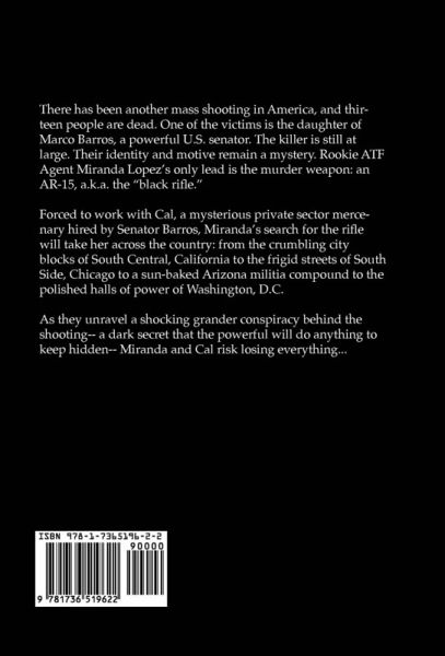 There are over 300 million guns in the United States. Imagine having to find just one. This is the problem rookie ATF Agent Miranda Lopez faces. There has been another mass shooting in America, and thirteen people are dead. But this time, it is different because one of the victims is the daughter of Marco Barros, a powerful pro-gun rights senator. The killer is still at large. Their identity and motive remain a mystery. Miranda's only lead is the murder weapon: an AR-15, a.k.a. the "black rifle." Forced to work with Cal, a mysterious private sector mercenary hired by Senator Barros, her search for the rifle will take her across the country: from the crumbling city blocks of South Central, California to the frigid streets of South Side, Chicago to a sun-baked Arizona militia compound to the polished halls of power of Washington, D.C. As she unravels a shocking grander conspiracy behind the shooting- a dark secret that the powerful will do anything to keep hidden- Miranda risks losing everything she loves...