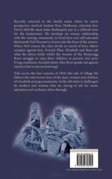 Recently returned to the family estate where he meets prospective medical student Rose Matheson, reluctant heir David Melville must make Rashiepark pay in a difficult time for the landowners. He develops an uneasy relationship with the mining community as local hero and self-educated blacksmith Neil Tennant is drawn into the lives of the miners. When Neil crosses the class divide in search of love, others conspire against him. Friends Phee, Elizabeth and Rose ask what the future holds whilst the women of the Stoneyrigg Rows struggle to raise their children in poverty and poor living conditions. Socialist miner Alex Birse speaks out against injustice but is anyone listening? Told across the four seasons of 1910, this gritty but heart warming tale of village life follows the interwoven lives of the men, women and children of a Scottish mining community. As the old order is challenged by workers and women who are daring to ask for more, optimism and resilience shine through. Some of the dialogue is in Scots which is easy to follow.