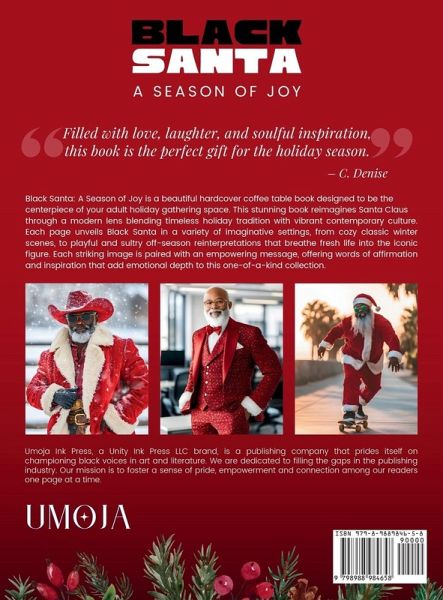Black Santa A Season of Joy is a beautiful hardcover, coffee table book, designed to be the centerpiece of your adult holiday gathering space. This stunning book reimagines Santa Claus through a modern lens, blending timeless holiday tradition with vibrant contemporary culture. Each page unveils Black Santa in a variety of imaginative settings, from cozy, classic winter scenes, to playful and sultry off-season reinterpretations that breathe fresh life into the iconic figure. Each striking image is paired with an empowering message, offering words of affirmation and inspiration that add emotional depth to this one-of-a-kind collection.