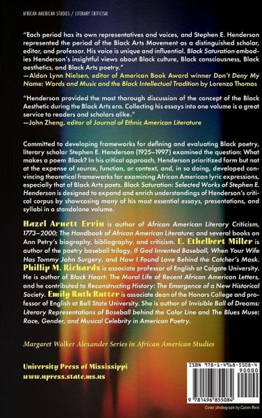 Committed to developing frameworks for defining and evaluating Black poetry, literary scholar Stephen E. Henderson (1925-1997) examined the question: What makes a poem Black? In his critical approach, Henderson prioritized form but not at the expense of source, function, or context, and, in so doing, developed convincing theoretical frameworks for examining African American lyric expressions, especially that of Black Arts poets. Black Saturation: Selected Works of Stephen E. Henderson is designed to expand and enrich understandings of Henderson's critical corpus by showcasing many of his most essential essays, presentations, and syllabi in a standalone volume. Henderson deftly conceptualized the ways in which aesthetic innovations were interwoven with revolutionary exigencies--a marriage of poetry and politics that became a hallmark of the 1960s and '70s. While other critics often ignored or fumbled to construct an adequate rubric for evaluating and celebrating Black Arts poetry--penned by Amiri Baraka, Carolyn Rodgers, Sonia Sanchez, Jayne Cortez, Mari Evans, Sarah Webster Fabio, Haki Madhubuti, and Larry Neal, among many others--Henderson constellated a triad of interdependent characteristics (structure, theme, and saturation) through which he examined Black literature in general and poetry in particular. Revisiting Henderson's scholarship in the third decade of the twenty-first century allows us, on the one hand, to further appreciate his imprint on current scholarship about Black literature, especially poetry, and, on the other, to introduce contemporary students and scholars to his salient theoretical frameworks, not to mention his persuasive critical style.