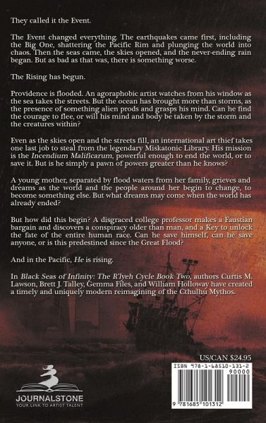 They called it the Event. The Event changed everything. The earthquakes came first, including the Big One, shattering the Pacific Rim and plunging the world into chaos. Then the seas came, the skies opened, and the never-ending rain began. But as bad as that was, there is something worse. The Rising has begun. Providence is flooded. An agoraphobic artist watches from his window as the sea takes the streets. But the ocean has brought more than storms, as the presence of something alien prods and grasps his mind. Can he find the courage to flee, or will his mind and body be taken by the storm and the creatures within? Even as the skies open and the streets fill, an international art thief takes one last job to steal from the legendary Miskatonic Library. His mission is the Incendium Malificarum, powerful enough to end the world, or to save it. But is he simply a pawn of powers greater than he knows? A young mother, separated by floodwaters from her family, grieves and dreams as the world and the people around her begin to change, to become something else. But what dreams may come when the world has already ended? But how did this begin? A disgraced college professor makes a Faustian bargain and discovers a conspiracy older than man, and a Key to unlock the fate of the entire human race. Can he save himself, can he save anyone, or is this predestined since the Great Flood? And in the Pacific, He is rising. In Black Seas of Infinity: The R'lyeh Cycle Book Two, authors Curtis M. Lawson, Brett J. Talley, Gemma Files, and William Holloway have created a timely and uniquely modern reimagining of the Cthulhu Mythos.