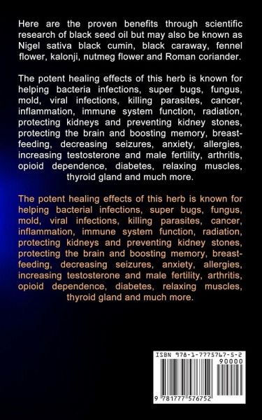 Here are the proven benefits through scientific research of black seed oil but may also be known as Nigel sativa black cumin, black caraway, fennel flower, kalonji, nutmeg flower and Roman coriander. The potent healing effects of this herb is known for helping bacteria infections, super bugs, fungus, mold, viral infections, killing parasites, cancer, inflammation, immune system function, radiation, protecting kidneys and preventing kidney stones, protecting the brain and boosting memory, breastfeeding, decreasing seizures, anxiety, allergies, increasing testosterone and male fertility, arthritis, opioid dependence, diabetes, relaxing muscles, thyroid gland and much more. The potent healing effects of this herb is known for helping bacterial infections, super bugs, fungus, mold, viral infections, killing parasites, cancer, inflammation, immune system function, radiation, protecting kidneys and preventing kidney stones, protecting the brain and boosting memory, breastfeeding, decreasing seizures, anxiety, allergies, increasing testosterone and male fertility, arthritis, opioid dependence, diabetes, relaxing muscles, thyroid gland and much more.
