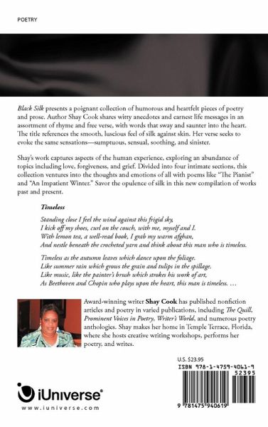 Black Silk presents a poignant collection of humorous and heartfelt pieces of poetry and prose. Author Shay Cook shares witty anecdotes and earnest life messages in an assortment of rhyme and free verse, with words that sway and saunter into the heart. The title references the smooth, luscious feel of silk against skin. Her verse seeks to evoke the same sensations-sumptuous, sensual, soothing, and sinister. Shay's work captures aspects of the human experience, exploring an abundance of topics including love, forgiveness, and grief. Divided into four intimate sections, this collection ventures into the thoughts and emotions of all with poems like "The Pianist" and "An Impatient Winter." Savor the opulence of silk in this new compilation of works past and present. Timeless Standing close I feel the wind against this frigid sky, I kick off my shoes, curl on the couch, with me, myself and I. With lemon tea, a well-read book, I grab my warm afghan, And nestle beneath the crocheted yarn and think about this man who is timeless. Timeless as the autumn leaves which dance upon the foliage. Like summer rain which grows the grain and tulips in the spillage. Like music, like the painter's brush which strokes his work of art, As Beethoven and Chopin who plays upon the heart, this man is timeless. ...