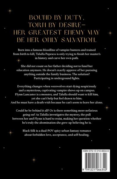 Bound by duty, torn by desire-her greatest enemy may be her only salvation. Born into a famous bloodline of vampire hunters and trained from birth to kill, Talulla Popescu is only trying to finish her master's in history and carve her own path. She did not count on her father deciding not to fund her education anymore. He doesn't exactly approve of her pursuing anything outside the family business. The solution? Participating in underground fights. Everything changes when werewolves start dying suspiciously and a mysterious, captivating vampire shows up on campus. Flynn Lancaster is a monster, and Talulla should want to kill him, yet she can't help but feel drawn to him. And he must have a death wish because he can't seem to leave her alone. Could he be behind it all? Or is there something more nefarious going on? As Talulla investigates the mystery, the pull between her and Flynn is hard to resist, making her question whether he's truly the abomination she grew up believing he is. Black Silk is a dual-POV spicy urban fantasy romance about forbidden love, acceptance, and self-healing.