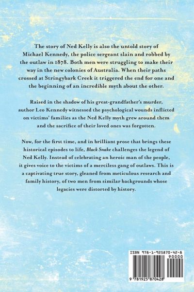 Author Leo Kennedy is the great-grandson of Sergeant Michael Kennedy. Raised in the shadow of his great-grandfather's murder, Leo witnessed the deep psychological wounds inflicted on successive generations of his family - and the families of other victims - as the Ned Kelly myth grew around them and the sacrifice of their loved ones was forgotten. Leo himself was nicknamed 'Red Ned' at school and taunted for being on the wrong side of Australian history. Now, for the first time, and in brilliant prose that brings these historical episodes to life, BLACK SNAKE challenges the legend of Ned Kelly. Instead of celebrating an heroic man of the people, it gives voice to the victims of a merciless gang of outlaws. This is a captivating true story, gleaned from meticulous research and family history, of two men from similar backgrounds whose legacies were distorted by history.