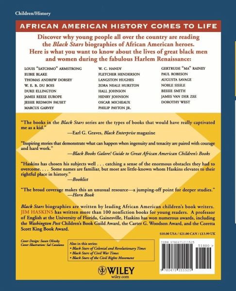 AFRICAN AMERICAN HISTORY COMES TO LIFE Discover why young people all over the country are reading the Black Stars biographies of African American heroes. Here is what you want to know about the lives of great black men and women during the fabulous Harlem Renaissance: louis "satchmo" armstrong eubie blake thomas andrew dorsey w. e. b. du bois duke ellington james reese europe jessie redmon fauset marcus garvey w. c. handy fletcher henderson langston hughes zora neale hurston hall johnson henry johnson oscar micheaux philip payton jr. gertrude "ma" rainey paul robeson augusta savage noble sissle bessie smith james van der zee dorothy west carter g. woodson "The books in the Black Stars series are the types of books that would have really captivated me as a kid." -Earl G. Graves, Black Enterprise magazine "Inspiring stories that demonstrate what can happen when ingenuity and tenacity are paired with courage and hard work." -Black Books Galore! Guide to Great African American Children's Books "Haskins has chosen his subjects well . . . catching a sense of the enormous obstacles they had to overcome. . . . Some names are familiar, but most are little-known whom Haskins elevates to their rightful place in history." -Booklist "The broad coverage makes this an unusual resource-a jumping-off point for deeper studies." -Horn Book