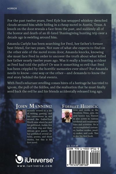For the past twelve years, Fred Kyle has wrapped whiskey-drenched clouds around him while hiding in a cheap motel in Austin, Texas. A knock on the door reveals a face from the past, and suddenly all of the horror and death of an ill-fated Thanksgiving hunting trip over a decade ago is swirling around him. Amanda Carlyle has been searching for Fred, her father's former best friend, for two years. Not sure of what she expects to find on the other side of the motel room door, Amanda knocks, knowing she must face Fred in order to uncover the truth about what killed her father nearly twelve years ago. Was it really a hunting accident as Fred had told the police? Or was it something so evil that Fred has been crippled by the horrific memories ever since? But Amanda needs to know-one way or the other-and demands to know the real story behind the fatal events. With Fred's reluctant retelling comes hints of a heritage he has tried to ignore, the pull of the fiddles, and the realization that he must finally send back the evil he and his friends accidentally released long ago.