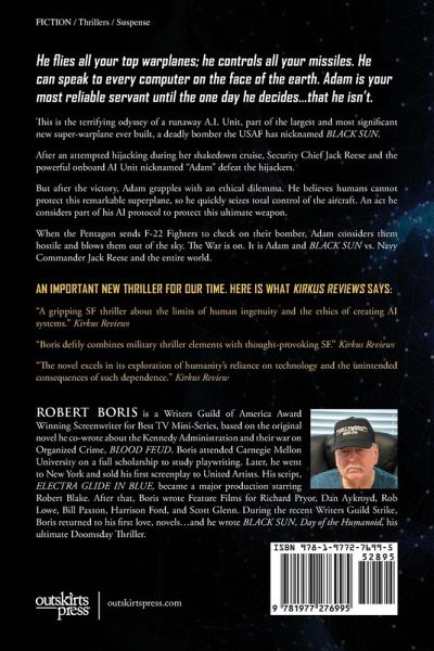 The deadliest new warplane ever built by man has been hijacked by the most brilliant A.I. Unit ever created by science. The final war for America has begun, with only two things at stake...the future of mankind and the survival of civilization. Commander Jack Reese, an ex-Navy SEAL, is Chief of Security for the new hypersonic warplane, Black Sun. When dark forces try to seize the incredible plane in flight, Reese and Adam, his onboard AI Unit, defeat the threat and regain control. But Adam quickly decides that humans cannot protect this aircraft, so he seizes all systems and takes control of all nuclear weapons. When the Pentagon sends F-22 Raptors to investigate, Adam reads them as hostile and blows them out of the sky. A gripping Global War Thriller instantly ignites with relentless Sci-Fi Action by Writers Guild Award-Winner Robert Boris. If you like your action bold and daring, your thrillers with non-stop tension, and your suspense with all the white-knuckle thrills of a roller coaster ride from hell...then sign in, buckle up, and grab your copy! Jack Reese is your protagonist...relentless and resourceful. Adam is your antagonist...brilliant and unpredictable, with sudden outbursts of uncontrollable violence. Welcome aboard BLACK SUN for the ride of a lifetime. Then confront the question the whole world is asking: Have we finally created the Frankenstein Monster of our own destruction?