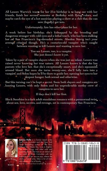 "Black Sunshine gives vampire romance Halle's signature plot twists, anti-heroes, and incredible chemistry. I fell in love with Solon and this dark vampire romance!" - Giana Darling, USA Today Bestselling author A contemporary dark-toned romance with a vampire twist, from the New York Times bestselling author of A Nordic King and Sins & Needles All Lenore Warwick wants for her 21st birthday is to hang out with her friends, finish her second year at Berkeley with flying colors, and maybe catch the eye of a hot musician playing a show at a club that she can now (legally) get into. Unfortunately, fate has other plans for her. A week before her birthday, she's kidnapped by the brooding and dangerous stranger with cold eyes and a lethal touch, who has been stalking her on San Francisco's fog-shrouded streets. Absolon "Solon" Stavig isn't your average criminal though. He's a centuries-old vampire who's caught between wanting to kill Lenore and wanting to save her. You see Lenore, too, is a vampire. She just doesn't know it yet. Taken by a pair of vampire slayers when she was just an infant, Lenore was raised never knowing her true nature. All Lenore knows is that she has (normal) parents who love her, that she's exceptionally smart, and she's squeamish around blood. But once she turns twenty-one, she'll fully turn into a vampire, and Solon hopes he'll be there to guide her, opening her eyes to her deepest hunger...both sexual and otherwise. But this turning can't be kept a secret. Soon both slayers and vampires are hunting Lenore, with only Solon and his unpredictable motley crew of vampires to save her. If they don't kill her first.