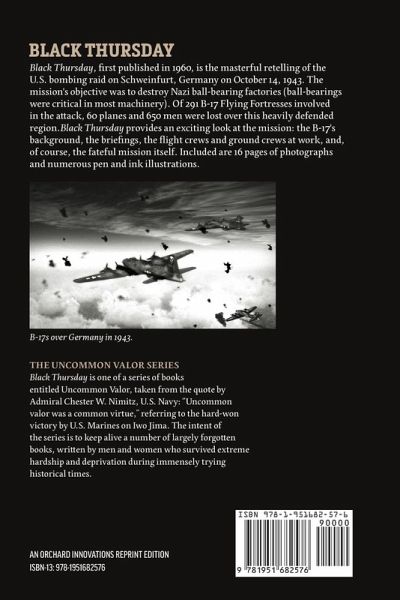 Black Thursday, first published in 1960, is the masterful retelling of the U.S. bombing raid on Schweinfurt, Germany on October 14, 1943. The mission's objective was to destroy Nazi ball-bearing factories (ball-bearings were critical in most machinery). Of 291 B-17 Flying Fortresses involved in the attack, 60 planes and 650 men were lost over this heavily defended region. Black Thursday provides an exciting look at the mission: the B-17's background, the briefings, the flight crews and ground crews at work, and, of course, the fateful mission itself. Included in this reprint edition are 16 pages of photographs, numerous pen and ink illustrations, and a comprehensive index.