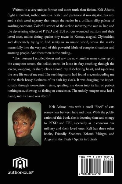 The moment I scrolled down and saw the now familiar name come up on the computer screen, the hellish storm let loose its fury, reaching through the screen, wrapping its sharp claws around my disbelieving heart, and squeezing the very life out of my soul. The seething storm had found me, enshrouding me in the thick heavy bleakness of its dark icy cloak. It was dragging me impersonally through non-existent time, spiraling me down into its lair of perfect nothingness, showing no feeling or conscience. The unholy tempest now had a name, and its name was death. Written in a unique format, colorful stories of the airline industry, the war in Iraq, online dating, quaint tiny towns in Kansas, magical Clydesdales, and desperately trying to find sanity in an insane world, weave the reader masterfully into the very soul of this amazing fabric of complex situations and interesting people. More truth than fiction, Keli Adams, flight attendant, author, intuitive healer, and paranormal investigator, has created a rich word tapestry that wraps the reader in a brilliant silky palette of swirling emotions. And then there is the ending