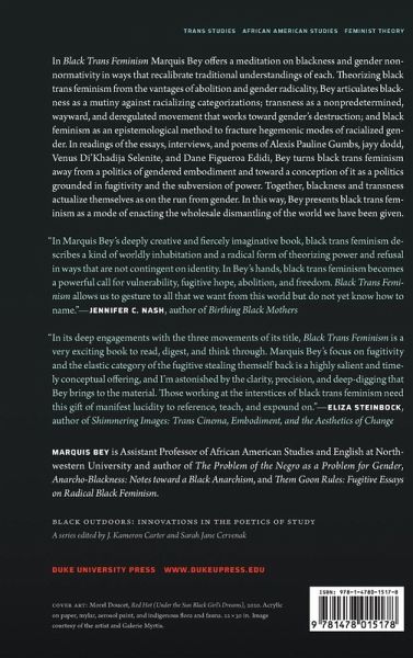 In Black Trans Feminism Marquis Bey offers a meditation on blackness and gender nonnormativity in ways that recalibrate traditional understandings of each. Theorizing black trans feminism from the vantages of abolition and gender radicality, Bey articulates blackness as a mutiny against racializing categorizations; transness as a nonpredetermined, wayward, and deregulated movement that works toward gender's destruction; and black feminism as an epistemological method to fracture hegemonic modes of racialized gender. In readings of the essays, interviews, and poems of Alexis Pauline Gumbs, jayy dodd, and Venus Di'Khadijah Selenite, Bey turns black trans feminism away from a politics of gendered embodiment and toward a conception of it as a politics grounded in fugitivity and the subversion of power. Together, blackness and transness actualize themselves as on the run from gender. In this way, Bey presents black trans feminism as a mode of enacting the wholesale dismantling of the world we have been given.