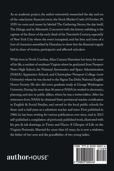 As an academic project, the author extensively researched the day and era of the cataclysmic financial event, the Stock Market Crash of October 29, 1929: its roots and causes he labeled The Gathering Storm; the day itself, The Deluge; and its Aftermath. Concurrent with the history unfolding is the capture of the flavor of the early third of the Twentieth Century, especially of New York City where the event transpired, and the lives and loves of a host of characters assembled by Hanrahan to show that the financial tragedy had its share of victims, participants and affected onlookers