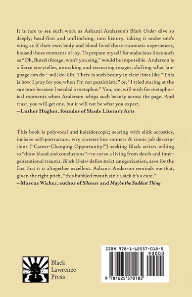 Winner of the Spring 2020 Black River Chapbook Competition. The poem from which BLACK UNDER derives its title opens with a resounding declaration: "I am black and black underneath." These words are an anthem that reverberates throughout Ashanti Anderson's debut short collection. We feel them as we navigate her poems' linguistic risks and shifts and trumpets, as we straddle scales that tip us toward trauma's still-bloody knife in one turn then into cutting wit and shrewd humor in the next. We hear them amplified through Anderson's dynamic voice, which sings of anguish and atrocities and also of discovery and beauty. BLACK UNDER layers outward perception with internal truth to offer an almost-telescopic examination of the redundancies-and incongruences-of marginalization and hypervisibility. Anderson torques the contradictions of oppression, giving her speakers the breathing room to discover their own agency. In these pages, declarations are reclamations, and joy is not an aspiration but a birthright.