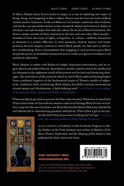 In Black Utopias Jayna Brown takes up the concept of utopia as a way of exploring alternative states of being, doing, and imagining in Black culture. Musical, literary, and mystic practices become utopian enclaves in which Black people engage in modes of creative worldmaking. Brown explores the lives and work of Black women mystics Sojourner Truth and Rebecca Cox Jackson, musicians Alice Coltrane and Sun Ra, and the work of speculative fiction writers Samuel Delany and Octavia Butler as they decenter and destabilize the human, radically refusing liberal humanist ideas of subjectivity and species. Brown demonstrates that engaging in utopian practices Black subjects imagine and manifest new genres of existence and forms of collectivity. For Brown, utopia consists of those moments in the here and now when those excluded from the category human jump into other onto-epistemological realms. Black people-untethered from the hope of rights, recognition, or redress-celebrate themselves as elements in a cosmic effluvium.