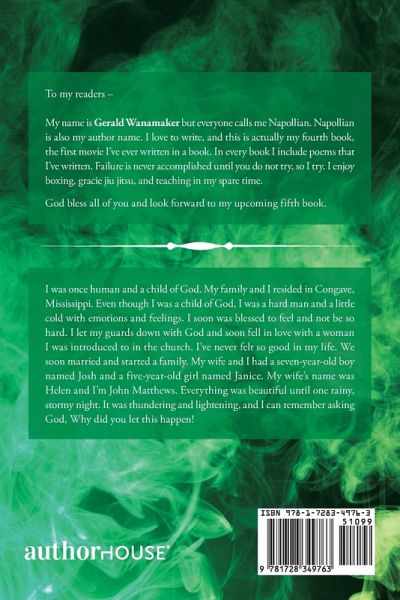 I was once human and a child of God. My family and I resided in Congave, Mississippi. Even though I was a child of God, I was a hard man and a little cold with emotions and feelings. I soon was blessed to feel and not be so hard. I let my guards down with God and soon fell in love with a woman I was introduced to in the church. I've never felt so good in my life. We soon married and started a family. My wife and I had a seven-year-old boy named Josh and a five-year-old girl named Janice. My wife's name was Helen and I'm John Matthews. Everything was beautiful until one rainy, stormy night. It was thundering and lightening, and I can remember asking God, Why did you let this happen!