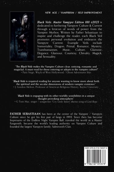 Black Veils: Master Vampyre Edition 888 is dedicated to furthering Vampyre Culture & Current through a lexicon of words of power from the Vampire Mythos. Written by Father Sebastiaan to inspire and challenge the reader, each Black Veil promotes personal evolution and embraces the Vampyre Current. Example Veils include Immortality, Dragon, Primal, Romance, Mystery, Transhumanism, Music, Culture, Glamour, Elegance, Glamour, Courtesy, Chivalry, Magick, and Sensuality. Featuring a foreword by renowned occult, paranormal and metaphysical author and radio host Rosemary Ellen Guiley (The Encyclopedia of Demons and Demonology, Vampires Among Us), Black Veils has inspired praise from the spiritualist and supernatural community: "The Black Veils makes the Vampire Culture clear, enticing, romantic and magickal. A must-read for those entering or adepts in the vampire culture!" ¿ Patti Negri, Witch of West Hollywood / Ghost Adventures Star "Black Veils is required reading for anyone wanting to know more about both the spiritual and the secular dimensions of modern vampire existence." ¿ J. Gordon Melton, Professor of American Religious History, Baylor University "Black Veils is engaging with its other worldly sensibilities in a unique thought-provoking atmosphere." ¿ G Tom Mac, singer / songwriter "Cry Little Sister," theme song of Lost Boys Read less